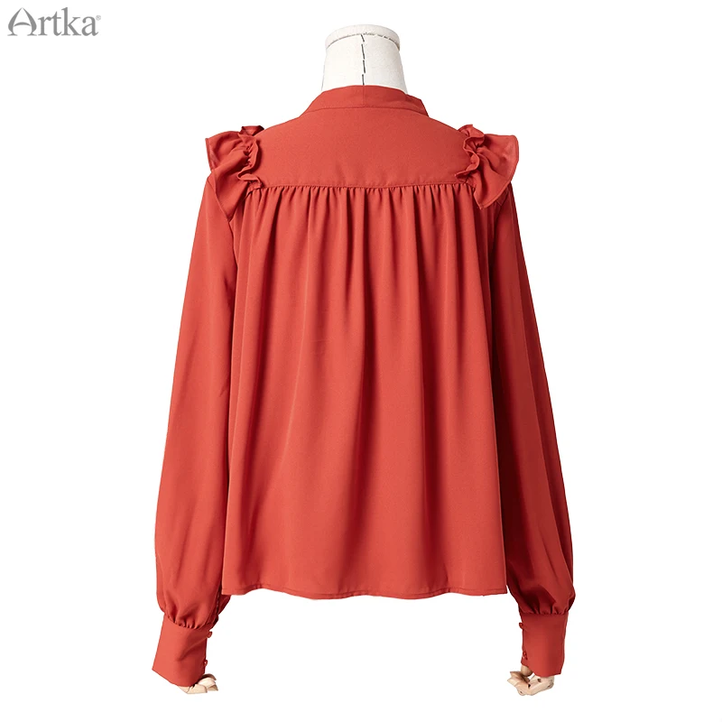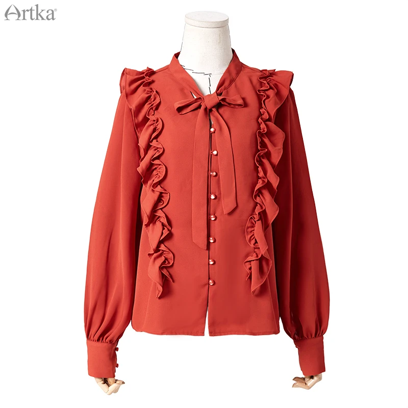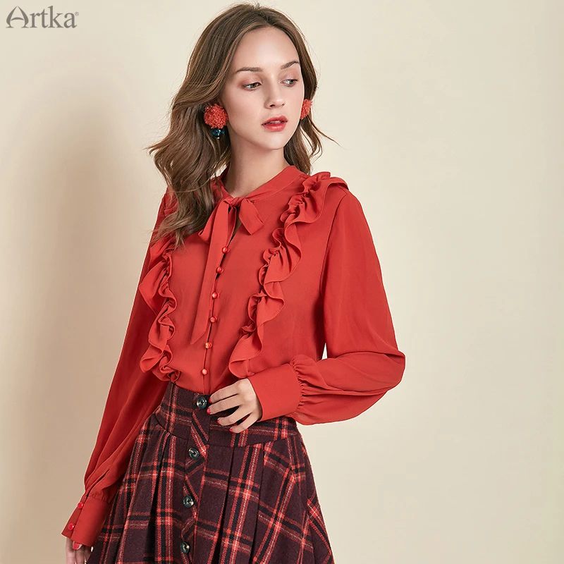 Best ARTKA 2019 Autumn New Women Blouses Elegant Chiffon Shirt Vintage Ruffled Decorative Bow O-Neck Lon