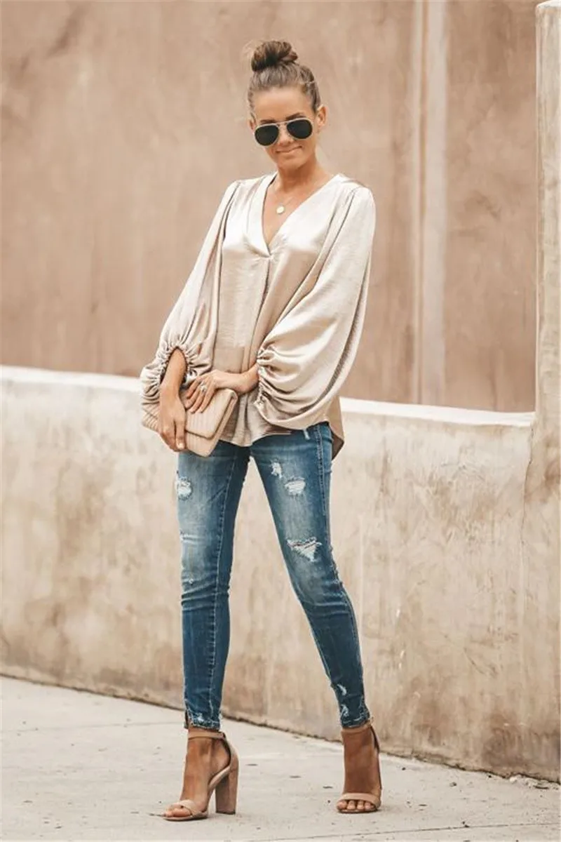 Best Women Blouses Office Lady Shirts Sexy V-Neck Low Cut Lantern Sleeve Loose Elegant Smooth Silk And S