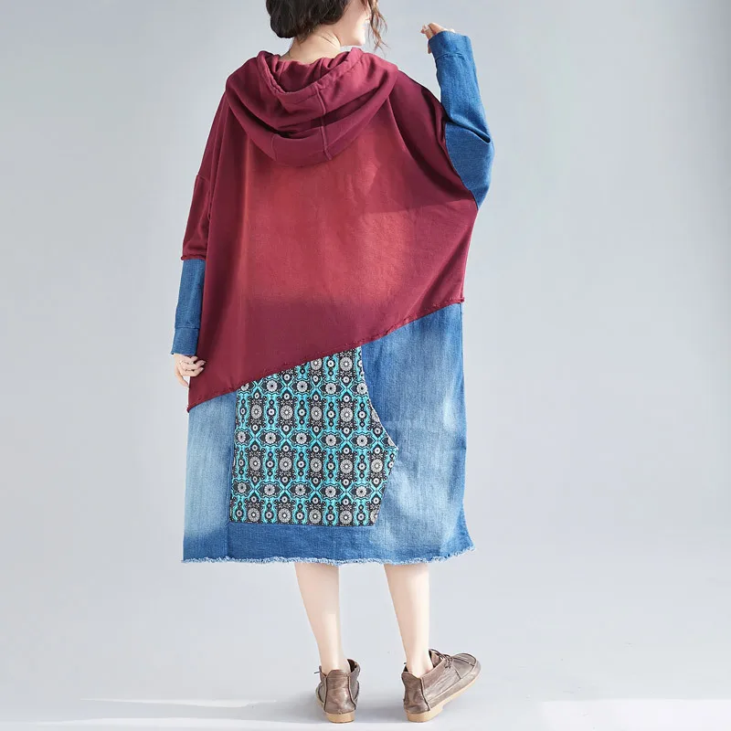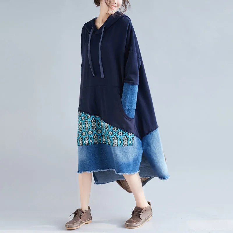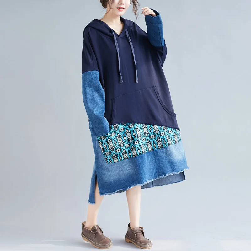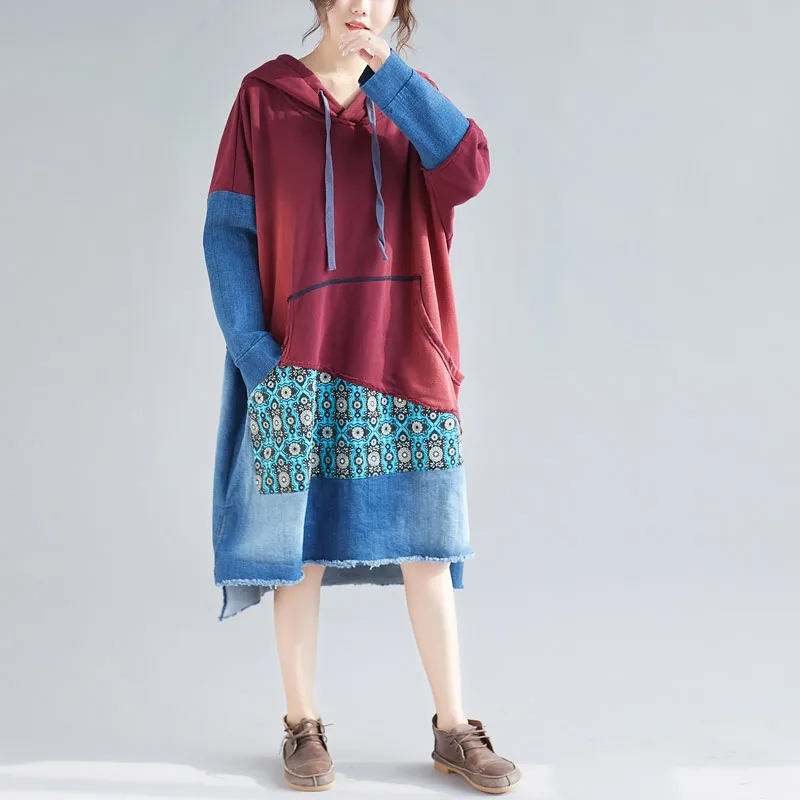New 2019 Oversized Hooded Long Sweatshirt Dress Women Patchwork Loose Retro Pullovers Plus Size Baggy D