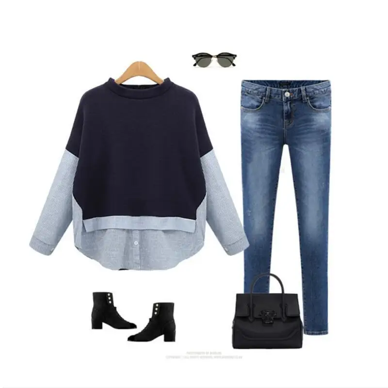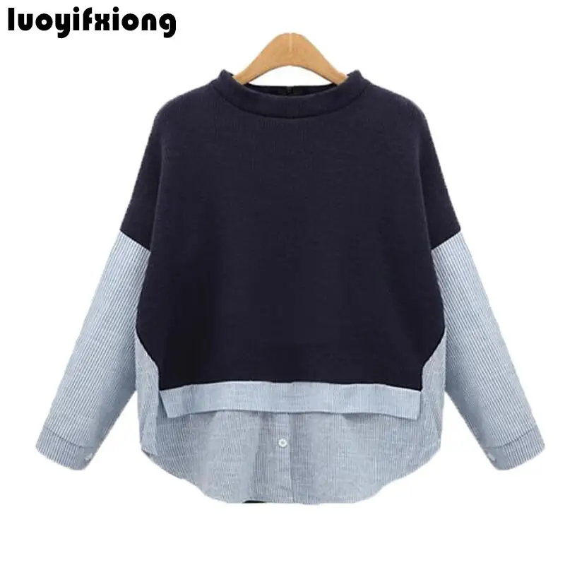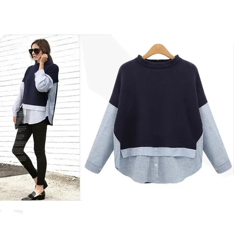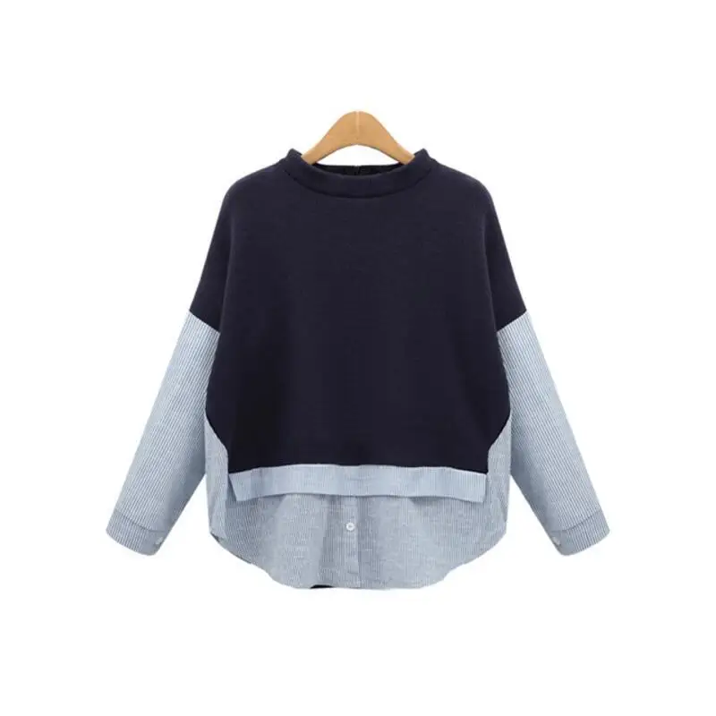 Best 2019 New Women Blouses Loose Stand Collar Long Sleeve Striped Patchwork Fake Two Pieces Shirts Navy