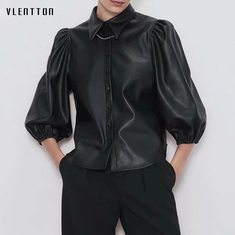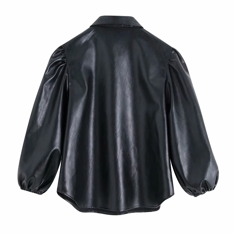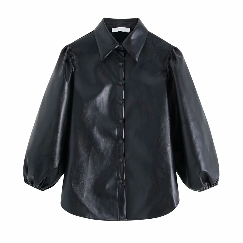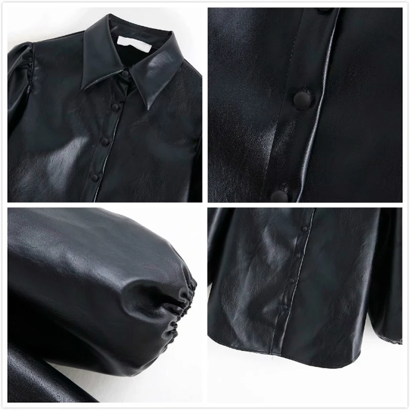 New 2019 Autumn New Puff sleeve Short Blouse Women Fashion Button Solid Faux Leather Shirts Ladies Casu